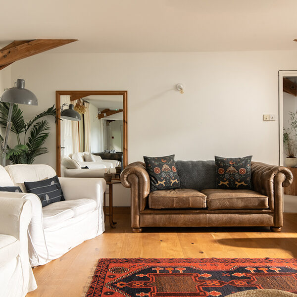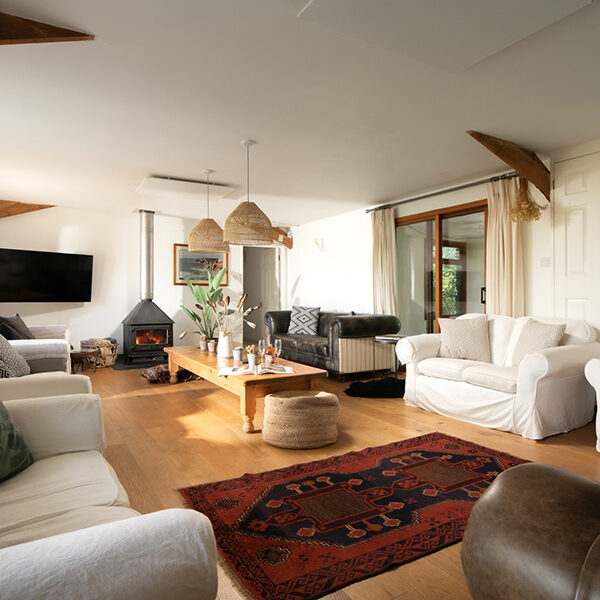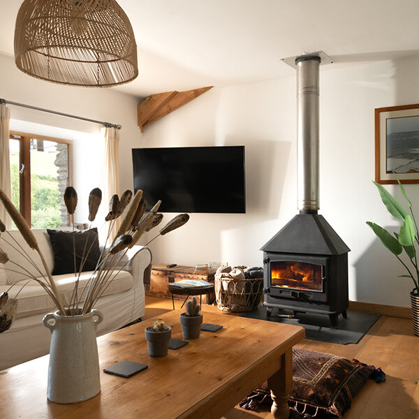 This huge room (9.5m x 4.5m) is immediately above the kitchen/dining room, with 7 sofas there is plenty of comfortable seating for everyone and it has some great views down to the river. A large wood burning stove (some logs and kindling are provided for your first fire and are just outside in the porch), creating a lovely ambience during winter breaks and can be completely enclosed with the fireguard when in use.